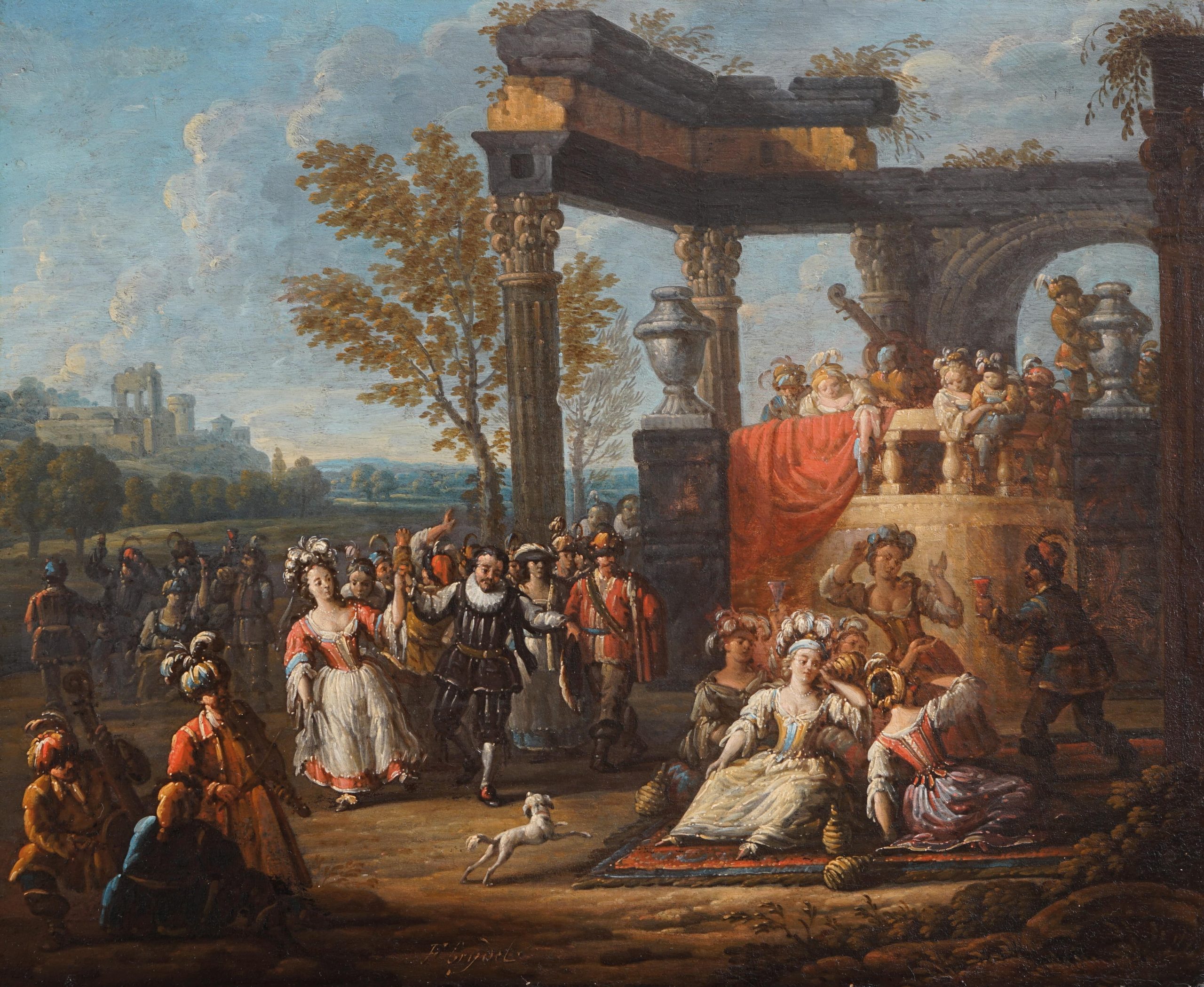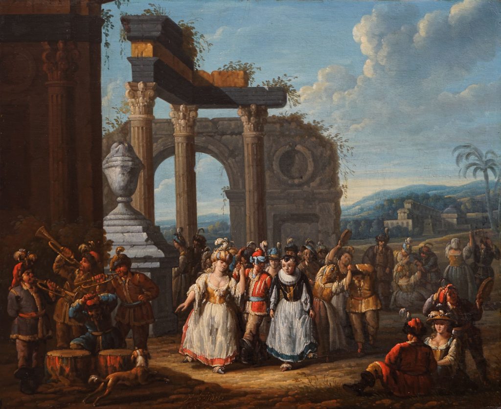 Karnevalsszenen und elegante Landpartien in römisch anmutenden Ruinenlandschaften waren seine Spezialität. Die beiden Gemälde bilden ein Pendant und zeigen in einer antikisierenden Ruinenlandschaft Musiker mit Blas-, Streich- und Schlaginstrumenten und kostümierte Personen. Dabei wird die Szenerie einer Theaterbühne gleich mit einer Ideallandschaft hinterfangen und schafft ein Bild der oberen Gesellschaftsschicht des 18. Jahrhunderts.